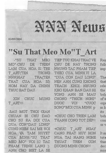 Một sáng cuối tuần tôi gặp bài phỏng vấn giữa cô PV xinh đẹp Thu Huyền và bạn T_art. Suýt nữa thì tôi nói to lên rằng “Ơ, T_art này…”. Thấy vui vui khi “gặp” T-art trên trang số 7 của tờ Người lao động chủ nhật. Ở diễn đàn NNN tôi cũng chỉ biết T_ art qua Net mà đã coi như bạn bè “ người trong nhà ta cả” , nhưng T_art ạ nếu đã chọn con đường mình đi thì mong bạn thẳng tiến “chân cứng đá mềm” vượt qua những khó khăn nếu có , để đi đến đích cuối cùng .Hy vọng năm 2007 và 2008 T_art sẽ thành công hơn nữa như T_art dự định trong bài trả lời phỏng vấn của báo.