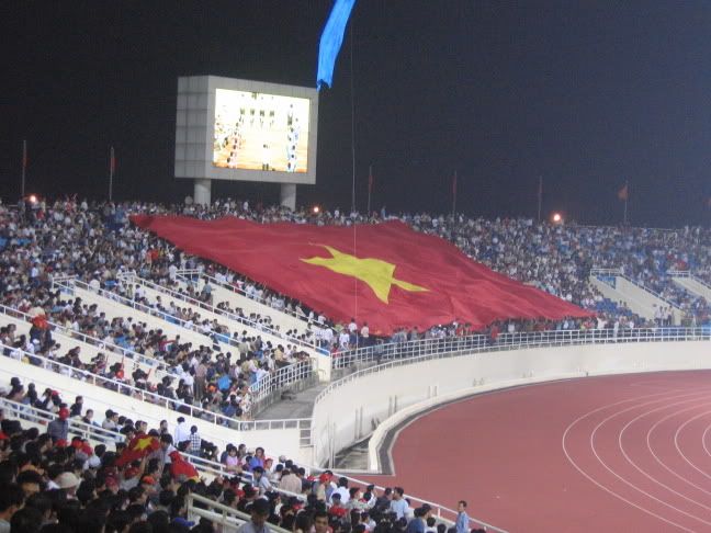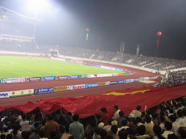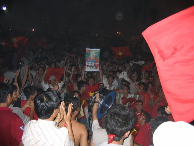 Khán đài chật cứng, hai anh em nhà này cũng góp 2 cái áo đỏ và một lá cờ Tổ quốc trong cái rừng màu đỏ phủ kín các khán đài. Quân ta thua vỡ mặt, cái cách thua thật đáng chán, co cụm và rúm ró. Bác Hongducanh bình luận :"Bây giờ mới trở lại đúng là Việt Nam". Trước mặt, hai ông cổ động viên vừa xem diễn biến trên sân, vừa dí sát tai cái điện thoại vô tuyến để theo dõi tình hình trận Qatar-UAE. Khi UAE gỡ hoà 1-1, cả khán đài nổ tung, cứ như quân ta vừa ghi bàn. Sóng đỏ chạy quanh các khán đài, còn phía các cầu thủ chúng ta đang chạy hết hơi duới sân. Tan trận, mọi người đứng lại nghe ngóng tin từ sân quân khu 7. Chú Lân Trung, phát ngôn viên Liên đoàn bỗng bộp chộp nói vống vào loa một câu khá tối nghĩa:"Hoà 1-1, Việt Nam vào tứ kết Asian Cup". Ngay sau đó em đọc loa "nói lại cho rõ" cũng sai toét:" Trận đấu giữa UAE và Qatar đã kết thúc với tỉ số 1-1, đội tuyển Việt Nam đã lọt vào vòng tứ kết". Cả sân lại vỡ tung. Nhưng hoá ra lúc đó đang bù giờ. Hai anh em ra sân, đi đuợc một lúc lại thấy trong sân báo loa là tỉ số 2-1 nghiêng về UAE. Qúa đã!!!!Khán giả reo hò nhảy nhót, đốt đèn trời. Và từng dòng người cờ đỏ đổ về hồ Gươm. Còn sớm quá, các cửa hàng điện máy chưa đóng cửa. Đi qua cầu Trung Hoà, đã nghe thấy giai điệu "Như có bác Hồ trong ngày vui đại thắng" phát ra từ một dàn loa to tướng. Vòng qua phố Huế, cũng nghe thấy giai điệu này từ một củă hàng sát rạp Kim Đồng cũ ngày xưa. Nhớ nhiều năm trước, cửa hàng điện máy này luôn "chơi đẹp" khi vác tất cả loa đài ra mở ầm ĩ cho các cổ động viên nhảy nhót mỗi khi đội tuyển Việt Nam chiến tháng tại SEA Games hay Tiger Cup.