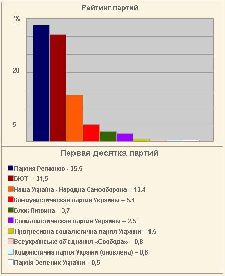 Theo kết quả sơ bộ hiện bà Timoshenko đang dẫn đầu với 34,41% số phiếu. Đảng Các Khu vực (PR) được 27,31%, khối "Ucraina của chúng ta" (NU-NC) - 18,01%, Đảng Cộng sản Ucraina - 4,77% và Khối Litvin - 4,69%.
